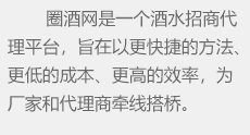 圈酒招商網(wǎng)是繼糖酒會(huì)之后的招商模式,為酒廠等生產(chǎn)經(jīng)銷企業(yè)搭建一個(gè)更好、更快的酒水招商平臺